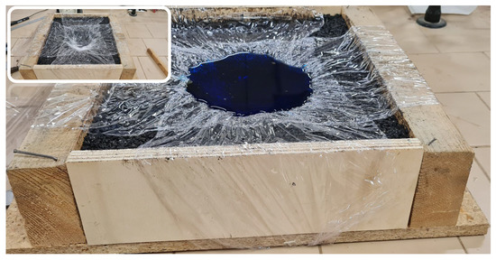 Laboratory tests were conducted on an asphalt tile simulating a real pothole (Figure 7). A 37 × 32 × 8 cm wooden formwork was filled with cold-mix asphalt and compacted until the upper surface was horizontal. A bowl shape has been opened near the tile’s centre to simulate a pothole.