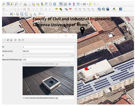 The position of the centre of the pothole where the robot must initially go and stand is obtained by reading the GPS data acquired with the NEO-6M GPS module during the survey. Before starting, the GPS antenna coincides with the centre acquired for defining the path around the pothole. The filter on the data to identify the position when the robot stands in the centre of the pothole is possible by comparing acquisition times of GPS data and images captured by the camera, already activated during the approach to the pothole. The open-source software QGIS [60] was used to visualise the volume, the amount of fill material, and the pothole’s position as a point on the map, with an attached image of the pothole. A Python script automated this operation. The code loads the list of pothole coordinates, volumes, and backfill material from a CSV file, creates a new point layer “POTHOLES” in QGIS, and adds the referenced points, the attributes “Volume” and “Material to Fill Potholes” to the layer. It also allows the user to select the photo for each point by providing a photo path as input.