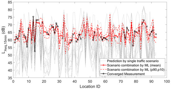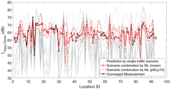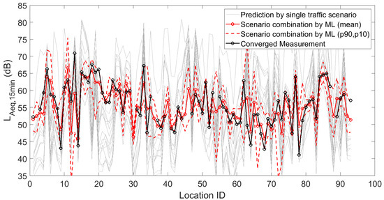 Deterministic predictions of LAeq,15min for each single traffic scenario, by the artificial neural network (showing the mean prediction and the 90th and 10th percentiles, based on repeated model constructions), together with the converged measurements, at each of the 93 locations where a sensor node is/was operational. Data shown here are the linearly averaged LAeq,15min during the daytime.