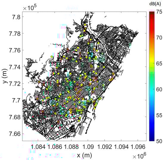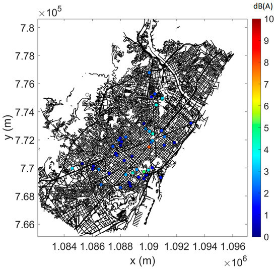 In Figure 4, Figure 5 and Figure 6, the measured data are plotted on the street map of Barcelona, complying with the selection criteria (see Section 3.1), the (mean) predictions at (all) sensor locations, and the difference between measurements and predictions where possible (as root-mean-square error, RMSE). As an example, daytime data only are shown. At most locations, prediction errors are limited, although a few points give rise to larger errors.