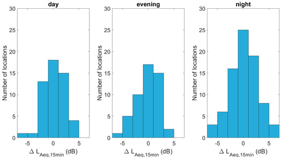 Histograms showing the difference between the (mean) predicted and measured LAeq,15min, linearly averaged over daytime, evening and night hours.