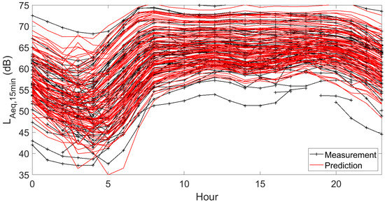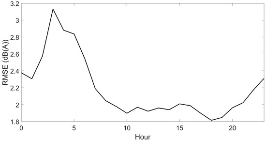 Results for hourly predictions are depicted in Figure 8, shown as temporal patterns over 24 h periods at each sensor location. The measured temporal patterns are shown as well. This figure does not allow the comparison of measurements and predictions at any individual sensor location, but it nicely shows that the bulk of the temporal patterns are well predicted. Both locations with a rather flat pattern and those with stronger level drops during the night hours can be distinguished, both in the measurements and predictions. Directly related to Figure 8, Figure 9 shows the hourly RMSEs. Minimum values are found around noon, near 2 dB(A), and increase slightly above 3 dB(A) between 3 and 4 o’clock at night.