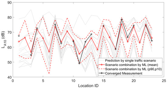 Deterministic predictions of the statistical sound pressure level LA10 for each single traffic scenario, by the artificial neural network (showing the mean prediction and the 90th and 10th percentiles, based on repeated model constructions), together with the converged measurements, at each of the 23 locations where a sensor node is present with detailed logging capabilities. Data shown here are linearly averaged over 15 min periods during daytime.
