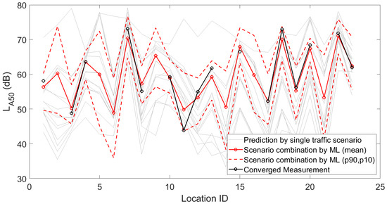 Deterministic predictions of the statistical sound pressure level LA50 for each single traffic scenario, by the artificial neural network (showing the mean prediction and the 90th and 10th percentiles, based on repeated model constructions), together with the converged measurements, at each of the 23 locations where a sensor node is present with detailed logging capabilities. Data shown here are linearly averaged over 15 min periods during daytime.