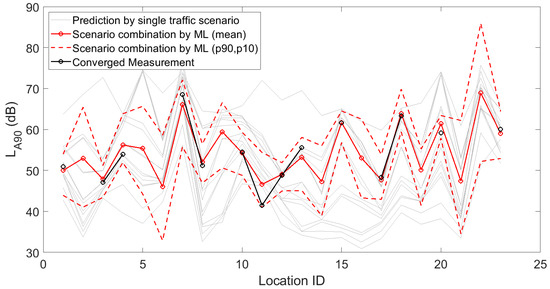 Deterministic predictions of the statistical sound pressure level LA90 for each single traffic scenario, by the artificial neural network (showing the mean prediction and the 90th and 10th percentiles, based on repeated model constructions), together with the converged measurements, at each of the 23 locations where a sensor node is present with detailed logging capabilities. Data shown here are linearly averaged over 15 min periods during daytime.
