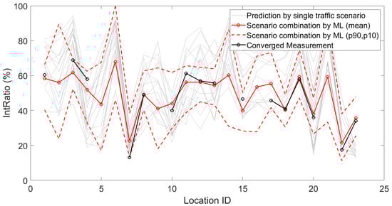 Deterministic predictions of the intermittency ratio for each single traffic scenario, by the artificial neural network (showing the mean prediction and the 90th and 10th percentiles, based on repeated model constructions), together with the converged measurements, at each of the 23 locations where a sensor node is/was operational with detailed logging. Data shown here are linearly averaged over 15 min periods during daytime.