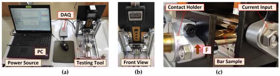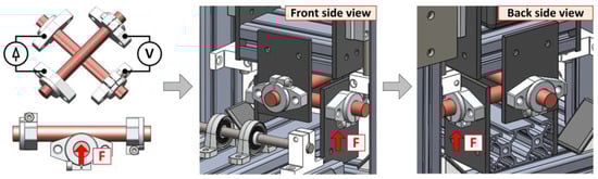 The inputs of the current clamps and the outputs of the voltage sensors are realized directly on the holders of the bars. The samples are mounted relatively freely in the holders so that they can be rotated during the contact resistance measurement and the “fresh contact surfaces” can be easily adjusted against each other. The complete realization of the measuring system with the stored weights and the detail of the brass crossing bars is shown in Figure 4a–c.