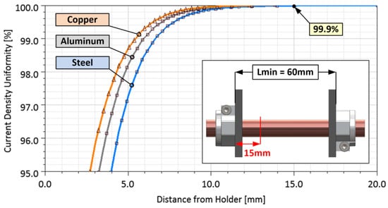 At a distance of LX = 15 mm from the holder, the uniformity of the current density reaches about 99.9%. It can be considered homogeneously distributed over the entire cross-section. This length is then in fact equal to half of the minimum necessary distance between the holders. For safety, the real holder distance is doubled (Lmin = 60 mm), as shown in Figure 6.