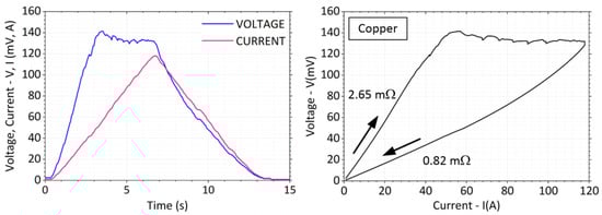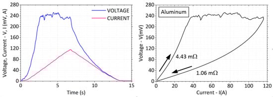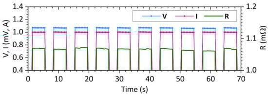 where Q (J) is the heat, m (kg) is the sample weight, cm (J·kg−1·K−1) is the thermal capacity, Δυ (K) is the temperature rise, R (Ω) is the sample resistance, I (A) is the magnitude of loading current, and t (s) is the time of its passing. After the modifications of (9), the temperature rise of the sample can be calculated: