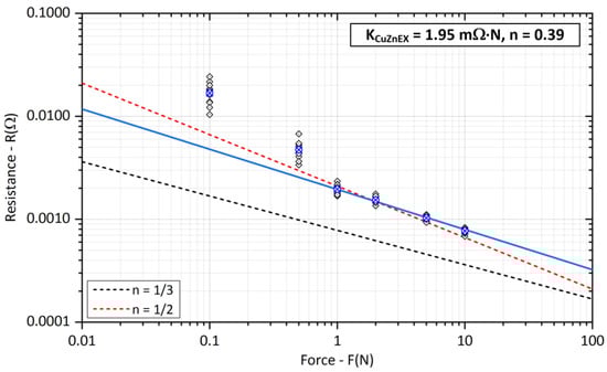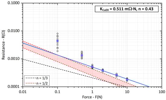 The design of the bar holders appears to be problematic, where applied forces F > 5 N lead to the bending of the specimen and a reduction in the contact force. For smaller forces F < 1 N, on the other hand, the influence of the connection and elasticity of the supply wires causes very poor repeatability of the experiments. This is reflected, among other things, by large deviations of the measured values in the case of smaller applied forces and is evident in all tested samples. The difference between the average and the two extreme minimum and maximum values reaches, for example, ±140% for copper bars and a load force of F = 0.5 N and ±200% for a force of F = 0.1 N. In the case of aluminum bars, this range of minimum and maximum resistance is smaller, but the contact resistance remains almost constant at both applied forces F = 0.1 N and 0.5 N. The above, due to the design limitations, was the main reason for the exclusion of contact resistance values at low values of the load force. The coefficient KC was then determined from the contact resistance values at load F > 1 N.