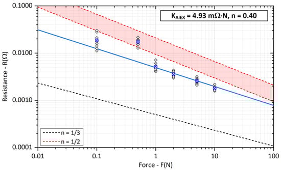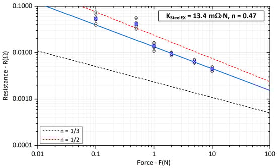 The coefficient KC generally depends on the contact material, the type of machining, and the condition of the contact surface and also includes the influence of surface layers. The exponent n is then chosen according to the type of contact (shape-dependent exponent of the contact force). Empirical determination of the contact resistance is also useful for flat or line contacts that cannot be easily calculated analytically [47,48,49].