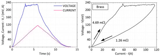 Current and voltage waveform with V-I characteristic for brass bars.