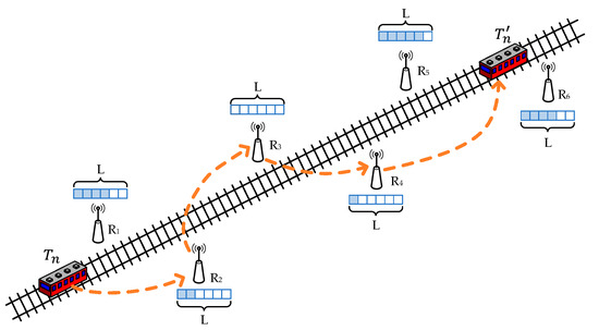 Therefore, for trains running on the rail, denoted as there are wayside relays distributed beside the rail, denoted as The train has high mobility; in order to ensure the quality of the T2W transmission, we assume that there are two orthogonal frequency bands available: band 1 for train-to-wayside (T2W) transmission [28] and band 2 for wireless wayside-to-wayside (W2W) transmission. Since the transmission is on two orthogonal channels, there is no interference between T2W and W2W transmission, while multiple W2W transmissions at the same time will cause interference.