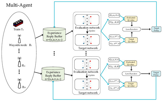 Since each node needs to make the decision to select the next-hop node, we use the multiagent dueling DQN (MADDQN) approach. MADDQN treats each node as an independent agent, and all the agents are trained centrally. When making the next-hop selection, the trained network parameters are shared with all nodes, and each node selects the next-hop node individually. The specific process of MADDQN is shown in Figure 2.