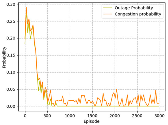 The goal of agent training is to better avoid outage events and reduce packet loss rate. As shown in Figure 4, the probability of outage events decreased dramatically in the first 1000 episodes, indicating that the agent learned to select next-hop relays within communication range. At the same time, the probability of network congestion gradually decreased during the training process, which illustrates that the agent successfully avoided congested nodes. The simulation results show that the MADDQN algorithm could effectively avoid outage and congestion events, ensuring the quality of transmission.