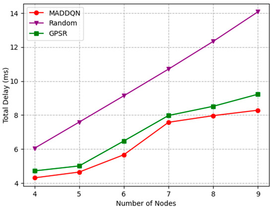 The distance between two adjacent trains is different and the wayside nodes are uniformly distributed. Thus, when the distance between two trains become larger, the number of trackside nodes between them increases and the topology of the network changes. Figure 5 depicts the curves of the variation of the total delay as the number of nodes increase. It can be observed that the whole-link delay increased from 4.31 ms to 8.43 ms under the MADDQN algorithm. The main reason is that, with the increment in the number of relays, the number of hops required for the whole link increased; thus, the total delay increased. Compared with the random selection scheme and GPSR algorithm, the transmission delay of the MADDQN algorithm was reduced by an average of 2 ms and 0.5 ms, respectively. Although the traditional GPSR algorithm requires a small number of hops, it cannot avoid congested nodes, resulting in a large packet loss rate. In addition, the random scheme can neither select nodes with small queued tasks nor optimize the hop count; hence, the delay is longer than the previous two algorithms.