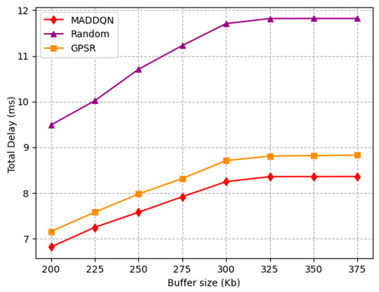 The effect of buffer size on total delay is investigated in Figure 6. When the buffer size was less than 300 Kb, the total latency increased significantly as the buffer size became larger. When the buffer size was small, the packet queue became shorter, resulting in lower packet delay. Moreover, when the buffer size reached 300 kb, the total delay gradually flattened out. The reason is that nodes were no longer dropping packets, and the queue length of each node tended to be stable. In addition, MADDQN improved by 0.5 ms compared to the GPSR algorithm and 3 ms compared to the random selection scheme, which illustrates that the proposed MADDQN algorithm could select nodes with shorter queues for transmission.
