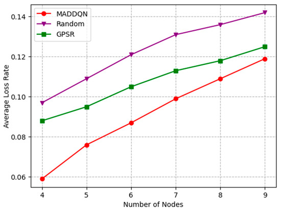 Figure 7 presents the relationship between the number of nodes and the average loss rate under different schemes. As the number of nodes increased from four to nine, the packet loss rate of MADDQN increased to 0.12. The reason is that, as the number of hops increased, the total packet loss rate also increased. Compared with the other two schemes, the proposed MADDQN could select the next-hop relay with a shorter queuing number for transmission, which greatly reduced the packet loss probability. While the GPSR algorithm could not avoid congested nodes, it required fewer hops for transmission; hence, the packet loss rate was also lower than the random scheme.