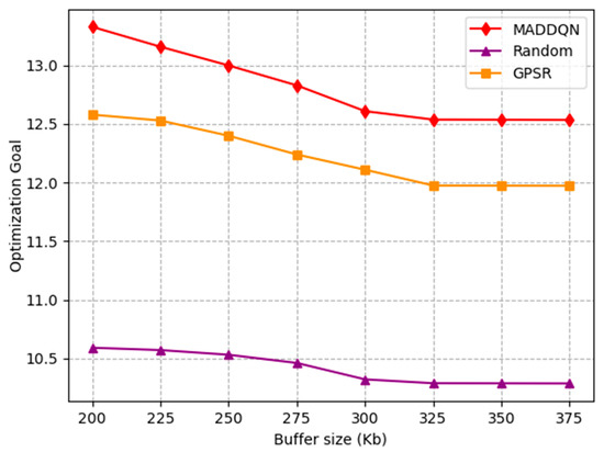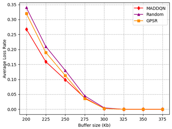 Figure 8 depicts the change in the average loss rate with the buffer size. The average packet loss rate rapidly decreased to zero when the buffer size was 300 kb. Due to the small buffer size, packets could easily overflow. Hence, the packet loss rate continued to decrease until the buffer was large enough. The average loss rate of the GPSR and random scheme before 300 kb was higher than MADDQN, which illustrates that our proposed method had a significant effect in avoiding congested nodes and reducing the number of hops, such that the packet loss rate was the lowest.