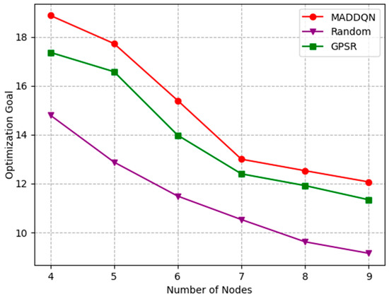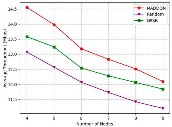 Figure 9 presents how the number of nodes affects the average throughput. It can be observed that the average throughput of the entire link decreased monotonically with the increment in the number of nodes. This is because, as shown in Figure 7, the packet loss rate increased with the number of nodes, it led to a reduction in the overall throughput. The throughput of MADDQN was greater than the other two methods, indicating that, when selecting the next hop node, MADDQN chose the node with relatively large channel throughput and fewer queued packets, ensuring channel quality.