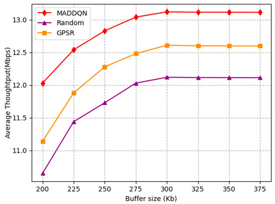 Figure 10 shows the impact of buffer size on the throughput. It can be observed that the throughput rapidly increased before 300 kb and then reached a stable state with increasing buffer size. This is because as the buffer size gradually increased, it caused a decrease in packet loss rate; therefore, the system throughput increased. When the system had no packet loss, the throughput tended to stable. Meanwhile, the proposed algorithm had the highest throughput compared with the other two schemes; hence, it can be proven that MADDQN was effective in selecting the routing with a large throughput.