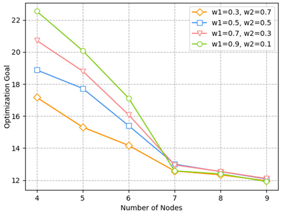 Relationship of optimization goal and number of nodes under different weights.