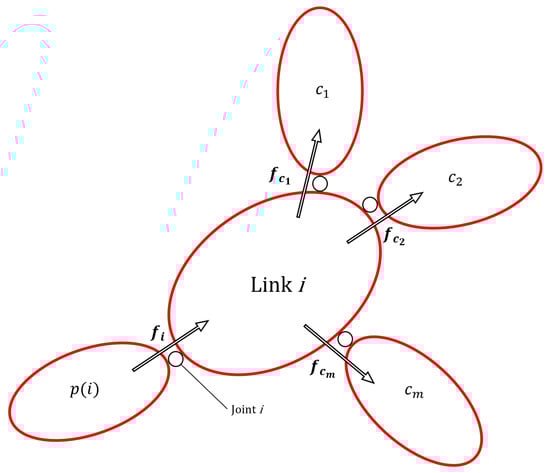 The matrix represents the coordinate transform matrix from the reference frame attached to the i-th link parent, i.e., p(i) and that of the i-th link (see Figure 1). , , , and are respectively the axis, the position, the velocity, and the acceleration of the joint that connects the parent link p(i) to the i-th link. is the inertia matrix of the i-th link. In the forward recursion, the equations of each link kinematics are computed: