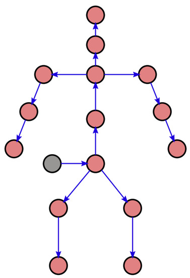 Computational flow during outward recursion. The red circles represent rigid bodies, whereas the blue arrows represent the joints connecting them. The grey circle represents the world and functions as a starting condition for the outward recursion.