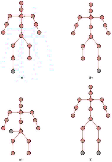 Trees used in the four gait phases. The grey circles represent the world link. Arrows represent the computational flow from the leaves to the root. (a) Left foot support; (b) Right foot support; (c) No support; (d) Double support.