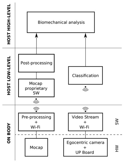 It is composed of two parts. The one on the bottom includes the devices which are worn by the user and the processing steps which are executed by these devices. The upper parts show the software modules, which run on a host PC, to execute the biomechanical analysis. The same architecture reports two data processing pipelines.