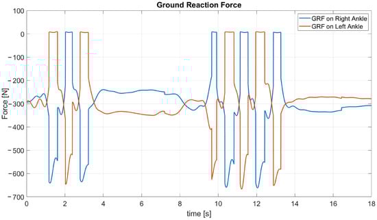 As stated before, the current gait segmentation approach is based on the height of the ankle joint, using a threshold that has proven itself quite accurate in the detection of the steps during the task, even if a better gait segmentation algorithm is necessary, and will be the next focus of this work. Concerning the ankle joint, in Figure 9 the forces exerted on the right and left ankles by the ground are reported.