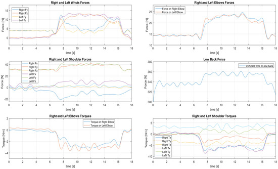 Regarding the upper human joints, the following panel of graphs in Figure 10 represents some of the forces and torques computed at the wrists (the pictures in position (1, 1) in the panel), elbows ((1, 2) and (3, 1) in the panel), shoulders ((2, 1) and (3, 2) in the panel), and lower back ((2, 2) in the panel) of participant 1, that is 1.70 m tall, aged 28, and has a mass of 64 Kg. Some forces or torques are reported only along some directions (as in the pictures of the panel regarding the elbows) for showing only the most interesting variables.