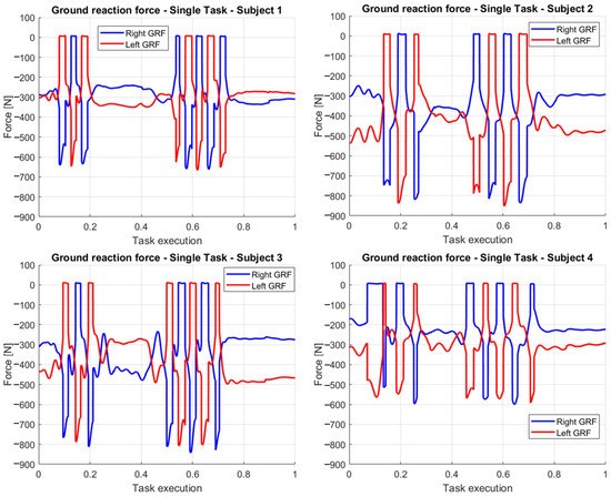 Ground reaction forces at the right and left ankles of the four participants, reported normalized with respect to the task execution.