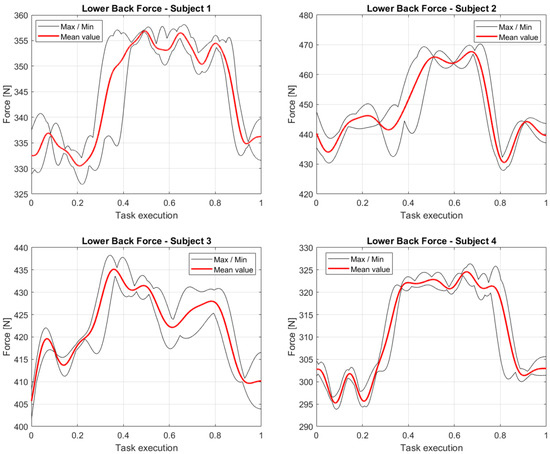 In Figure 12 the main components of lower back vertical forces are reported, after being processed as explained in the previous section. As expected, the forces are consistent with the masses of the participants and the box. The mean red lines are computed after the normalization (with respect to the task execution) and the alignment of all the data available for a precise participant. The final falling edge represents the instant when the participant drops the box on the target table diminishing the vertical load. The alignment works more effectively on that because the dropping of the boxes was the triggering event for stopping the recording. On the contrary, given that different velocities of execution have been observed in all the performances of the four participants, the mean rising edge has a major margin between the maximum and the minimum limit. For example, participant 2 shows the narrower plateaus, meaning that he was the fastest at taking the box, carrying it to the table, and dropping it. On the contrary, participant 4 and 1 shows larger plateaus, with differences in the uncertainties on the rising edge, meaning that participant 4 performed the task approximately at the same rate all five times. The force profile that differs the most from the others is the one relative to participant 3. Evaluating the other two forces at the examined joint, we noted how the mentioned participant would tend to slightly lean forward, diminishing the force in the investigated direction.