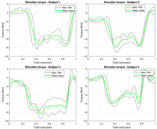 Shoulder torques, normalized with respect to the task execution, computed as the mean of the variables collected during the five repetitions of the assignment by the four participants.