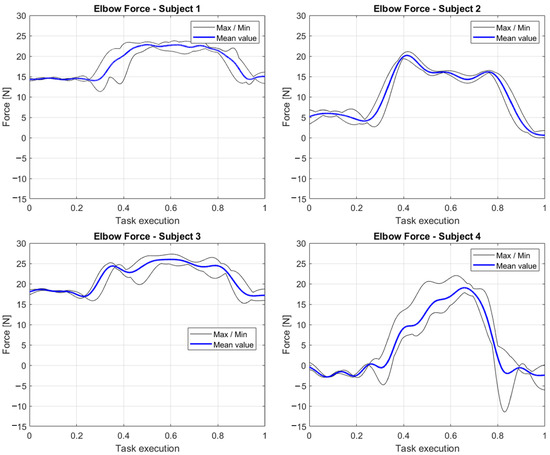 Elbow forces, normalized with respect to the task execution, computed as the mean of the variables collected during the five repetitions of the assignment by the four participants.