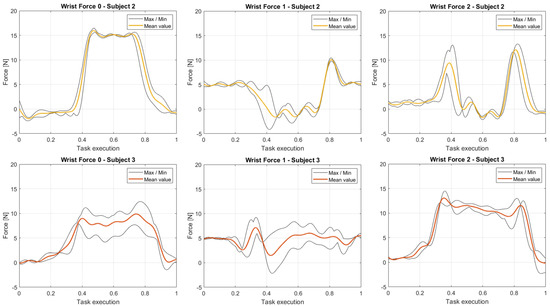 To present an example that shows how the rotation of the investigated articulation during the task affects the forces estimated, in Figure 15 we report the mean (together with the maximum and minimum limits) of the three components of the force at the wrists for the participants 2 and 3, normalized along the execution of the experimental procedure repeated for five times. The modules of the proposed forces are consistent with the masses of the body segments of interest (in this case the hands) and with the dynamics of the events during the procedure. Element 1 of the Force reported (that is to say the two graphs in the middle column of the panel) contain the main contribution in the unloaded walk (before taking the box), i.e., the gravitational component, however, the different behaviors of the examined participants lead to dissimilarities in the subsequent trends.