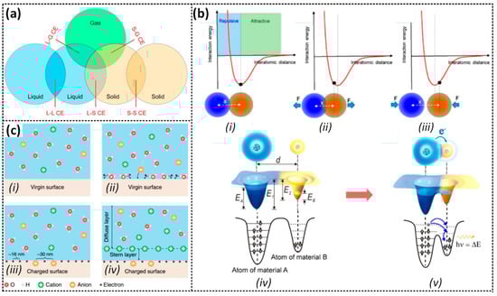 (a) Schematic of the contact electrification between different phases. (b) Interaction of two atoms at the (i) equilibrium position, (ii) repulsive region, and (iii) attractive region; (iv,v) electron transfer in contact. (c) Mechanism of contact electrification at the liquid–solid interface and formation of the EDL. Reproduced with permission from [40], 2022, American Chemical Society; and [41], 2020, Wiley.
