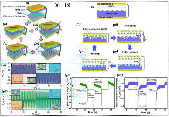 Similarly, a liquid–solid-based triboelectric generator (LSTEG) was proposed by Yang et al. [46], and can produce a significant amount of power, with a power density of 9.62 W/m2. The working mechanism of the LSTEG is illustrated in Figure 3b, where contact between a PTFE and water generates triboelectric charges on their surfaces (Figure 3(bii)). As the PTFE separates from the water surface, the negatively charged PTFE surface induces positive charges on Cu electrode 1, while negative charges are induced on Cu electrode 2 (Figure 3(biii)), generating a positive current flow through the external circuit until the PTFE returns to the initial position (Figure 3b(iv)). When the PTFE is pressed into contact again with the water, a reverse current flow occurs until a new state of equilibrium is reached (Figure 3(bv)). It is clear that one press–release cycle of the PTFE can produce an alternating current.
