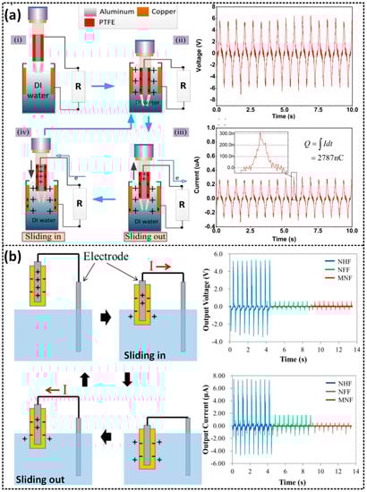 In addition, Lee et al. [47] reported a water-based TENG, in which an Al plate covered by Teflon AF 1600 (PTFE) periodic slides are either immersed into the water or emerge out of the water, as depicted in Figure 4b. When the PTFE and water are in physical contact, CE occurs, leading to the generation of negatively and positively charged PTFE and water surfaces, respectively. Once the PTFE emerges from the water, charged PTFE and water surfaces induce positive and negative charges on the Al and Cu electrodes, leading to generating a current flow through the external circuit, and maximizing when the PTFE is completely out of the water. When the PTFE immerses in the water again, a current flow with an inverse direction is generated in the external circuit. Therefore, the periodic slides that are either immersed into the water or that emerge out of the water can produce alternating currents. This is confirmed experimentally by the voltage and current outputs generated by the WTENG at a movement frequency of 2 Hz.