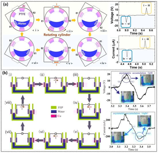 The working mechanism of the free-standing mode and typical voltage and current output signals of (a) the rotating water TENG: Generation of (i–iii) positive and (iv–vi) negative peak signals; and (b) the U-shaped TENG: Generation of (i–iv) positive and (v–viii) negative peak signals. Reproduced with permission from [56], 2016, Elsevier; and [20], 2017, Elsevier.