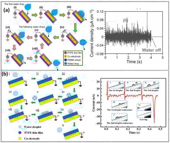 The working mechanism of the single-electrode mode and the typical output current signal of (a) a water-TENG with a superhydrophobic PTFE surface: (i) Precharged and (v) charged surfaces, water droplet in (ii & vi) contacting, (iii & vii) sliding, and (iv & viii) separated states with solid surface; and (b) the Wd-TENG: (i) Precharged and (vi) charged solid surfaces, water droplet in (ii & vii) contacting, (iii–iv & viii–ix) sliding, and (v & x) separated states with solid surface. Reproduced with permission from [15], 2014, Wiley; and [66], 2019, Wiley.