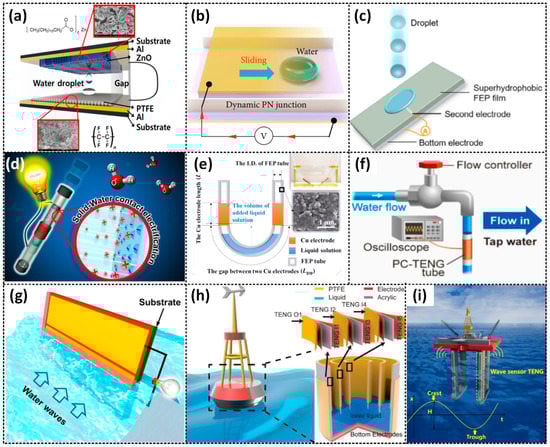 The L–S TENG can be regarded as a promising technology for transforming mechanical energy from liquid flow into electricity. Based on the source of the liquid dynamics, the L–S TENG can be divided into three main modes: the droplet [15,42,45,53,54,55,60,61,63,64,66,67,68,69,71,72,74,75,76,77,78,79,80], wave [33,44,49,50,51,52,56,59,65,81,82,83], and flow-based [19,20,58,62,73,84] modes. The most important source for L–S TENGs is water, which exists everywhere in nature in enormous amounts, as seen with raindrops, rivers, tides, and ocean waves. Therefore, the interaction modes of the L–S TENG will be reported in the following sections based on the water-TENG.