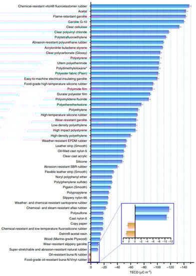 In addition to the charge-collecting layer, the material charge density and hydrophobicity play crucial roles in enhancing the output of TENG. It is essential for the contact layer material to possess a high negative charge due to the positive triboelectric properties of the liquid. To quantitatively evaluate the triboelectric effect and establish a standard, the triboelectric charge density (TECD) was measured to rank different materials (Figure 8) [97]. In a triboelectric series, some common materials have been used with low TECD, such as PVC, PTFE, PDMS, Kapton, and PVDF, equivalent to TECD values −117.5, −113.1, −102.2, −92.9, and −87.4 mC·m−2, respectively [97]. Moreover, the negative charge of the material can be enhanced through the utilization of an air-ionization gun, which induces corona discharging of the surrounding air. By employing corona discharging, the TECD can be increased by more than 5 times compared to the initial material [98]. Extensive research has also been conducted on improving output performance through the use of hydrophobic surfaces. Various methods have been employed to create highly hydrophobic surfaces, including the fabrication of nanostructures or hierarchical structures [71], artificial lotus-leaf structures [53], and plasma treatment [99]. It is noteworthy that the surface morphology of the contact layer affects the velocity of the liquid on the contact layer and the bouncing motion between the liquid–solid surface. The hydrophobic surface is characterized by contact and a sliding angle. High contact and a high sliding angle will increase the current output in the droplet single-electrode contact mode [45].
