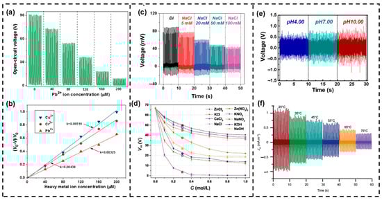 In order to achieve high output performance for energy harvesting, researchers have chosen materials with a high negative charge. Among the commonly used materials are FEP, PTFE, and PVDF, which are readily available and possess these characteristics [82,104,105]. However, the F-bonding of the hydrophobic layer when in contact with liquid will absorb the ions with low electronegativity, which decreases the TENG performance [19,32]. The high-electrical-conductivity ions are the reason for the low triboelectric charge on the hydrophobic layer. Additionally, the adsorbed ions on the electrode layer will gradually reduce the transfer electron charge between the liquid and solid surface [106]. As shown in Figure 9a,c, the output voltage decreases when the ion concentration increases. With different types of ions (Figure 9b,d), the voltage also has different values. The results indicated that the output performance depends a lot on the properties of the ions, thereby promising that the L–S TENG device can be used for ions or chemical detection. The pH value and temperature of the water are also other affecting parameters of the TENG. The same as with the ion concentration, the positive hydrogen ion (H+) increase leads to a decrease in the output voltage, as shown in Figure 9e [13]. As explained in the working principle, the anions causing an imbalance in the charge of liquid molecules leads to the difficulty of the liquid interacting with the solid surface, which is harmful to the output performance of the TENG. As shown in Figure 9f, the short-circuit current density (Jsc) decreases with increases in water temperature. The results can be explained by the decreasing rate of change in the dielectric constant and the polarity of water with increasing temperature [43].