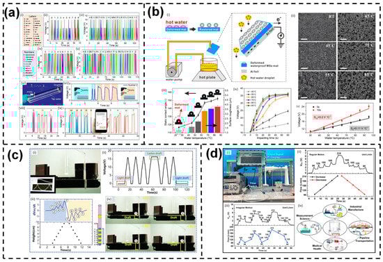 Regarding environmental monitoring, researchers have also introduced several self-powered sensors-based L–S TENGs with remarkable performance. In particular, a self-powered water temperature sensor was proposed by Xiong et al. by applying the self-restoring, waterproof, tunable SMPU microstructural mats to fabricate the TENG with excellent superhydrophobicity (SCA = 152.2°) [115]. The self-restoring capability of the MS mats ensures a stable triboelectric performance and a long lifespan, even under impact and heating using hot water, thanks to the gradually increasing surface roughness during the structural recovery process triggered by water temperature. A single-electrode water-TENG design is depicted in Figure 10b, producing a series of output voltages under varying water temperatures and impacting times. Moreover, the recovery of surface roughness was recorded, and it was observed that higher temperatures could expedite the recovery process before complete recovery.