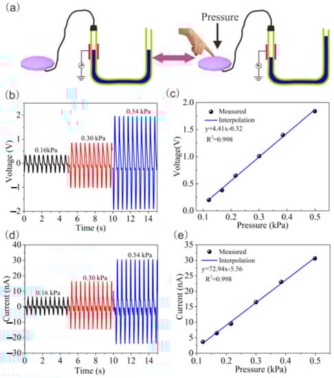 where V(t) is the water flow rate. As can be seem, the short-circuit current (ISC) is proportional to V(t) and ΔH. Here, the pressure applied (P) into the U-tube can be represented by the height difference in the liquid level, so the measured output performance is proportional to the pressure. As shown in Figure 11c,f, the relationship of open-circuit voltages and short-circuit current with pressure displayed good linear behavior (R2 = 0.998) under a low-pressure regime (from 0.16 kPa to 0.54 kPa). The result has shown that detailed information about the ambient mechanical motions can be monitored using the TENG device when combining the analysis of both the Voc and Isc measurements. Moreover, using a microfluidic channel design can shrink down the repeated system and achieve higher output performance compared to a U-tube structure. Due to its advantages of being battery-free, having a straightforward operating mechanism, and being inexpensive, self-powered sensors can be used in blood pressure monitoring, pulse waveform monitoring, electronic skin monitoring, and other applications.