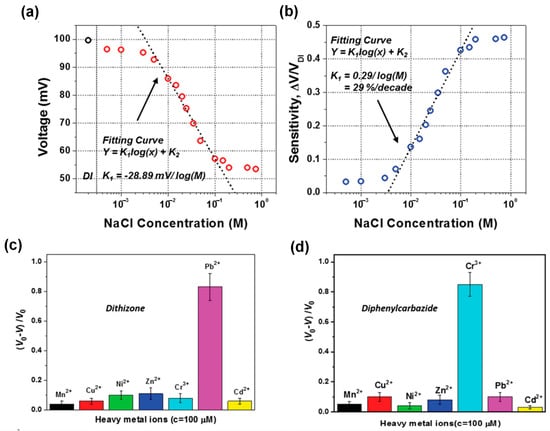 (a) Average output voltage values generated by various NaCl solution concentrations ranging from 0 to 0.75 M, and (b) the sensitivity of the sensor during its NaCl solution concentration. A test of the selectivity of the self-powered triboelectric sensor for (c) Pb2+ detection by using dithizone as the surface modifying agent; (d) Cr3+ detection by using diphenylcarbazide as the surface modifying agent. Reproduced with permission from [32], 2016, Wiley; and [106], 2016, Wiley.