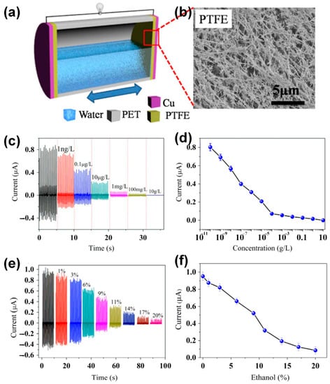 (a) Schematic illustration of the self-powered TENG sensor for organic concentrations and (b) the FESEM image of PTFE membrane surface; (c,d) short-circuit current for different formaldehyde concentrations; and (e,f) short-circuit current for different ethanol concentrations (percentage by volume). Reproduced with permission from [49], 2016, Elsevier.