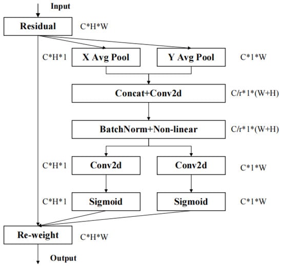 The CA attention mechanism is distinct from the CBAM mechanism in that it encodes channel relationships and long-term dependencies, utilizing precise location information to do so. The structure of the CA mechanism is illustrated in Figure 4. By pooling and stitching feature layers in different directions, precise position information can be obtained, resulting in a more accurate determination of the region of interest. The final feature map information is obtained by capturing channel connections through 1 1 convolution and combining a residual unit.